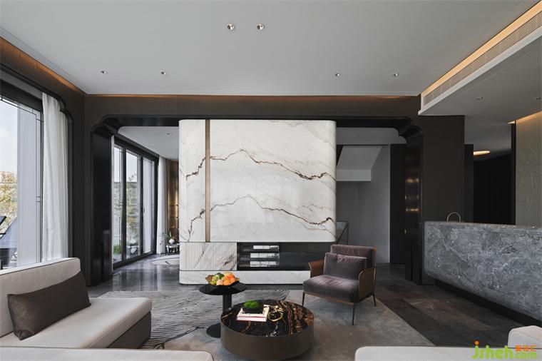尋一處現(xiàn)代境,幽趣婉轉(zhuǎn)。一層的客廳以光影流動,木飾面、大理石交織出不同層次秩序,給予空間精致質(zhì)感,布局打破常規(guī)的空間界限,強調(diào)空間線條感與生活功能性的思考,客廳、餐廳與閱讀區(qū)融合實現(xiàn)多場景對話打造生活空間,以連貫的手法和語言造型呈現(xiàn),向內(nèi)外延伸。開放式的格局,讓空間更為寬敞通透,營造舒展的氛圍。