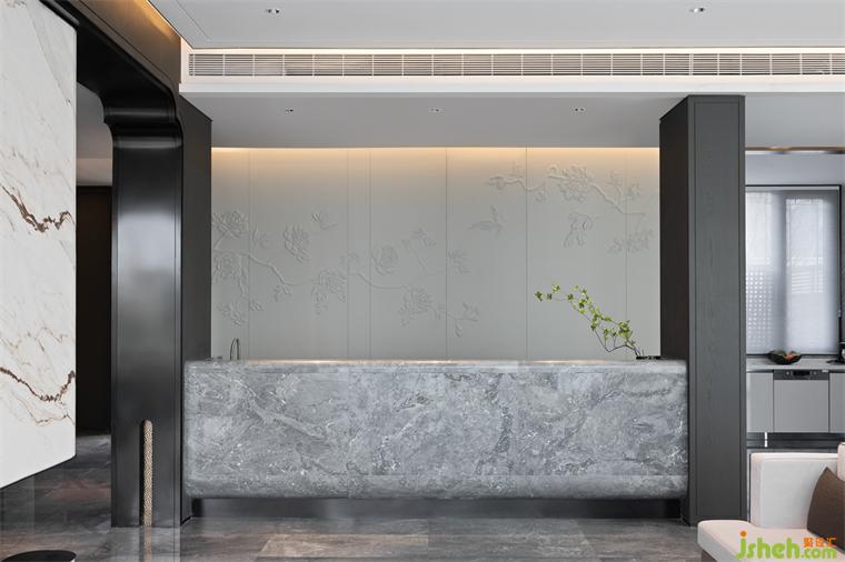 在空間本質(zhì)美的構(gòu)建上,墻面以富有中式韻味的元素勾勒出水吧臺(tái)背景,樣板房設(shè)計(jì)給空間賦予了別樣的情懷。加以瓷器與花藝的點(diǎn)綴,為空間添抹出東方謙遜的美學(xué)語(yǔ)言。