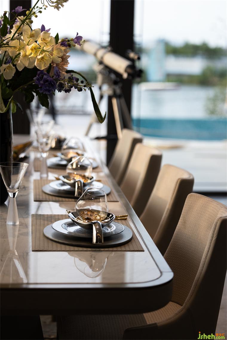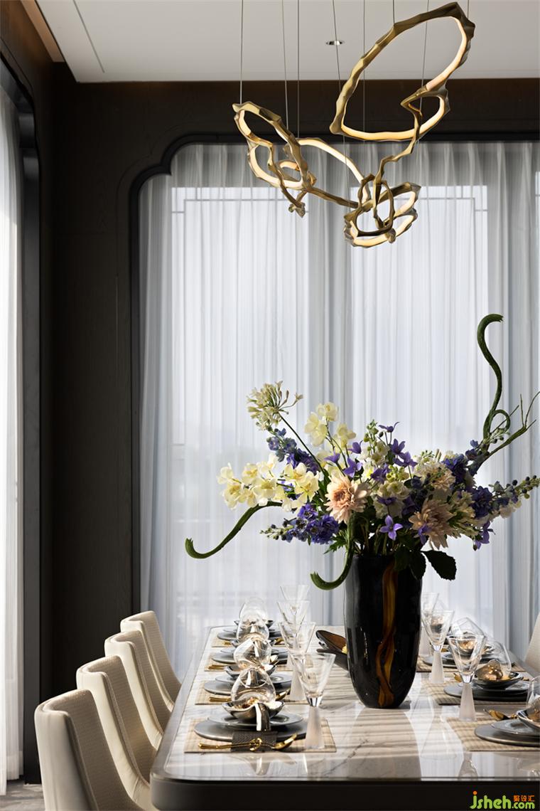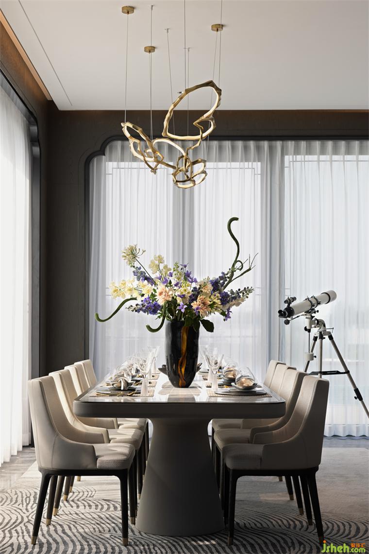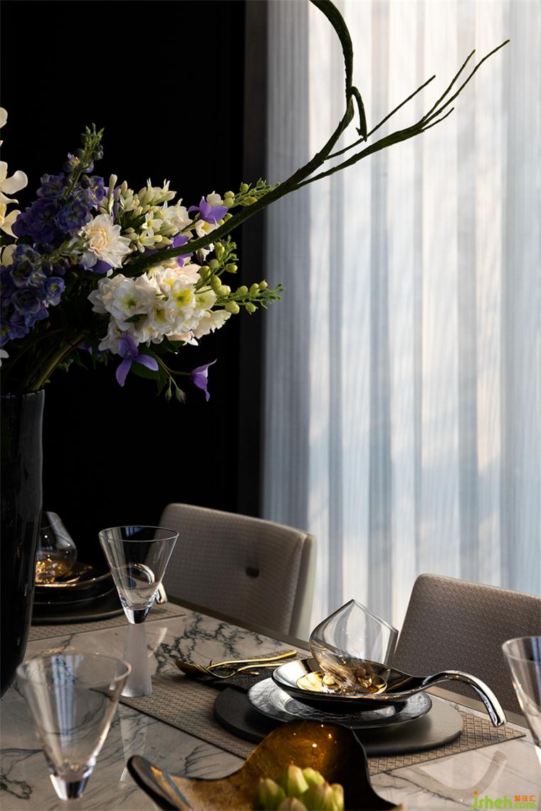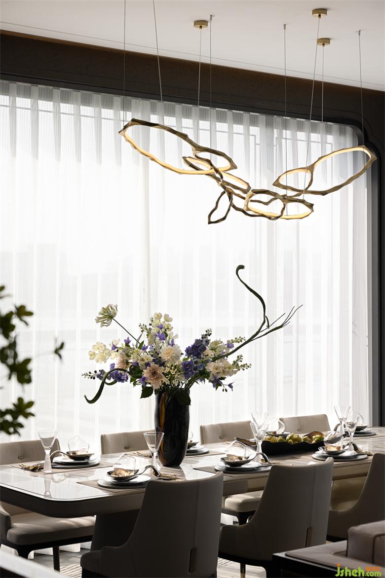 客廳與餐廳隔而未離,清冷透亮之意層層渲染,颯颯凈塵埃。鏡中萬(wàn)象,樣板房設(shè)計(jì)折射序列世界??臻g內(nèi)的陳設(shè)之物在在虛實(shí)互映中,交織出自然的現(xiàn)代詩(shī)意風(fēng)雅。