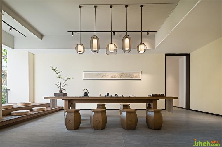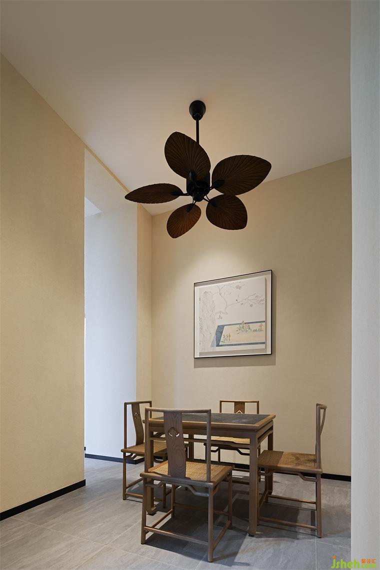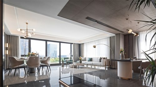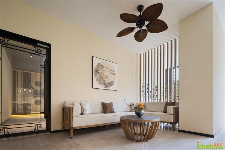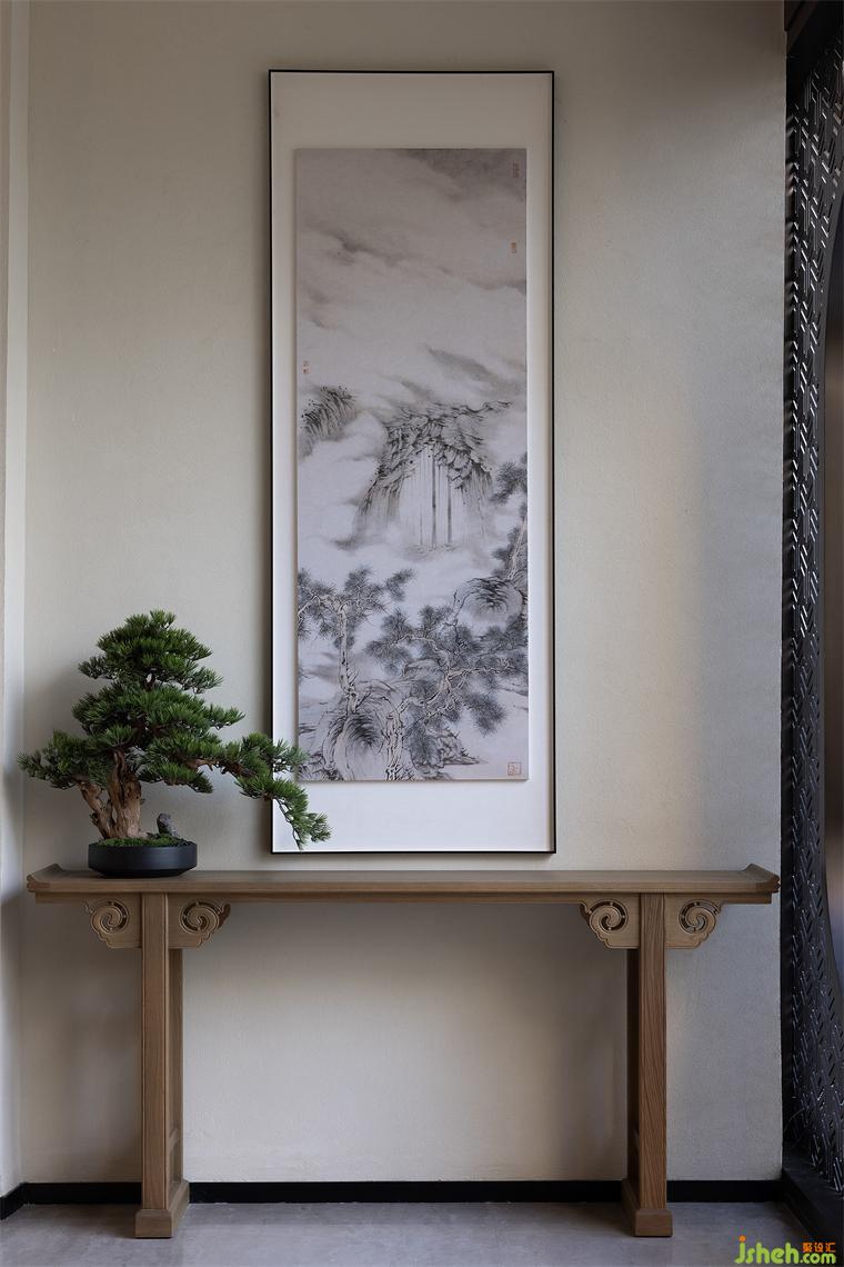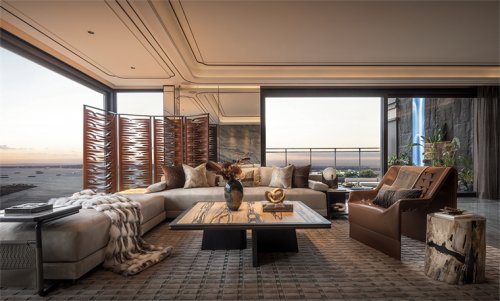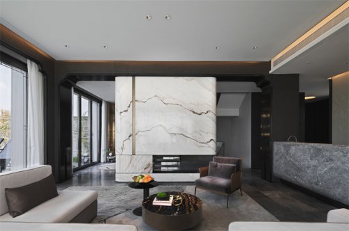 架空層共享休閑區(qū)延續(xù)海玥和鳴的靈動(dòng)基調(diào),會(huì)所設(shè)計(jì)門廳入口利用空間本身通透開放的建筑形制,拓展了縱深方向的空間敘事賦予空間流動(dòng)的設(shè)計(jì)語言。在軟裝陳設(shè)上,通過層次的格局規(guī)劃將自然材質(zhì)優(yōu)雅結(jié)合,營(yíng)造自由舒緩的氛圍,墻面的掛畫鋪陳出空間靜謐的美感,一個(gè)松弛有度、自然詩意的休閑活動(dòng)空間由此展開。