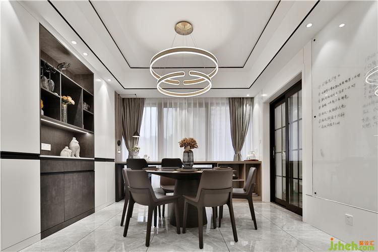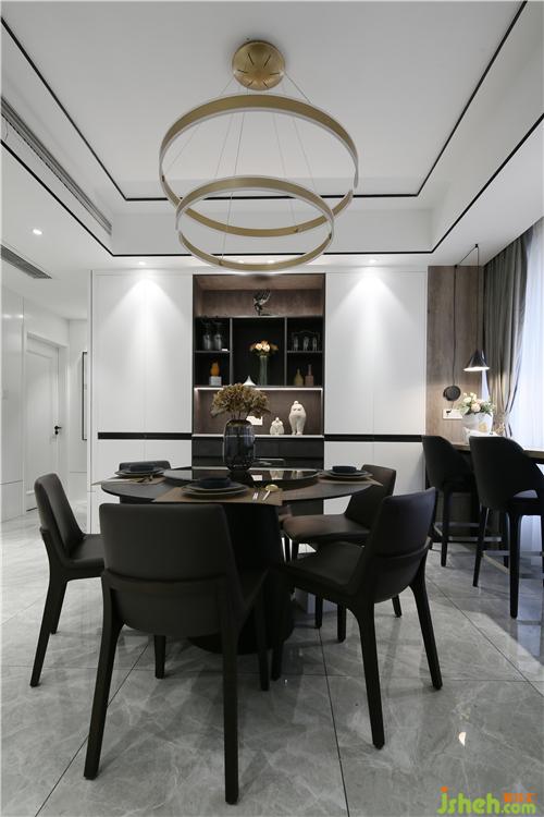 餐廳里設(shè)計(jì)了一排頂天立地柜+敞開格柜,做到有藏有露出。