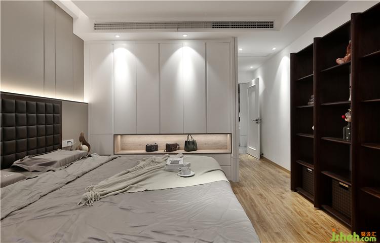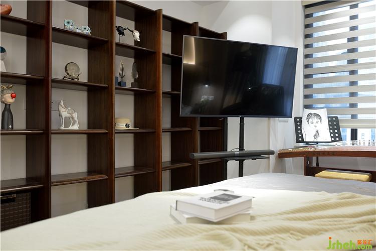 業(yè)主有一些自己喜歡的軟裝擺件,所以床對面設(shè)計了一個開放式儲物柜,可以擺放自己的心愛的收藏品及經(jīng)常用的生活用品。