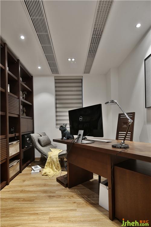 書房的書柜設(shè)計做到有藏有露,既有層次感又方便收納。窗簾設(shè)計的是百葉窗,方便通風(fēng)。