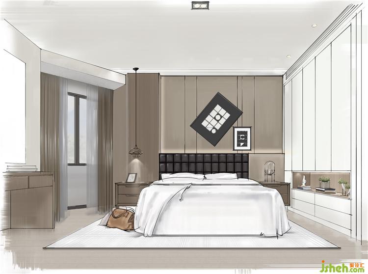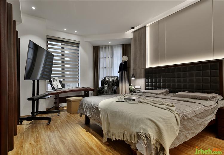 主臥用了一些木紋色,提高色彩飽和度,讓人更容易放松。家具用的也都是楷模的。