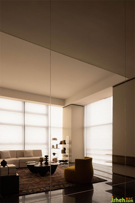 洽談區(qū)一側(cè)是大面積利落采光,另一側(cè)墻體為視覺上的凹陷設(shè)計,同樣是巧妙借用了建筑體塊營造空間感。仁恒前海夢公園售樓處設(shè)計采用百葉窗簾進行光線控制,可在一日之中隨著時間的變化而有不同的體驗。