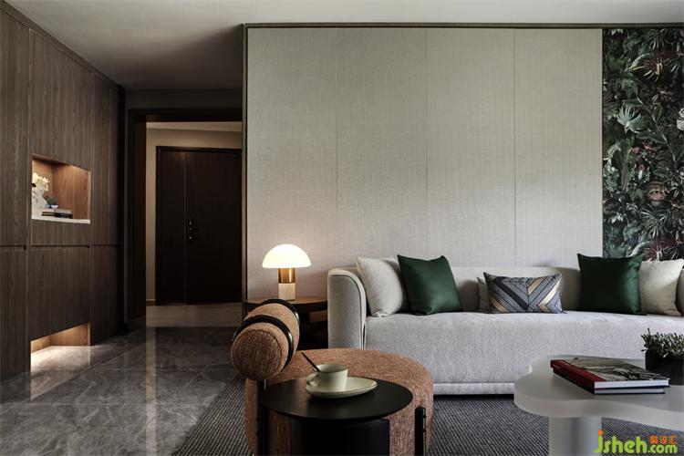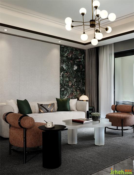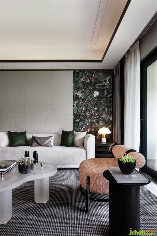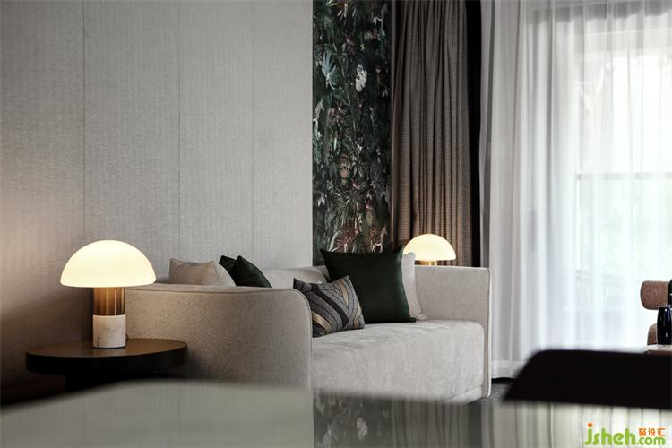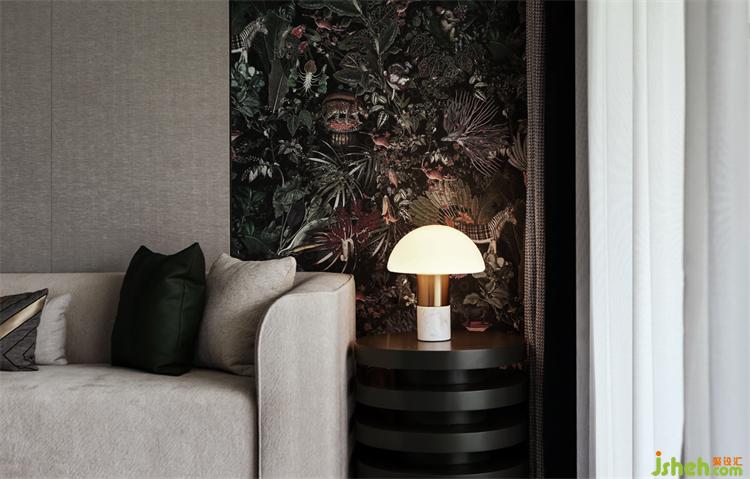 廣州亞運(yùn)城精裝樣板房設(shè)計(jì)沙發(fā)背景墻紙選用arte與moooi聯(lián)合創(chuàng)作的主題墻紙,郁郁蔥蔥的植被,栩栩如生的動物,在燈飾的映照下,讓人仿佛身處奇妙叢林,微風(fēng)輕拂紗簾,攜光線到訪,動靜之間,自然意趣悄然而生。