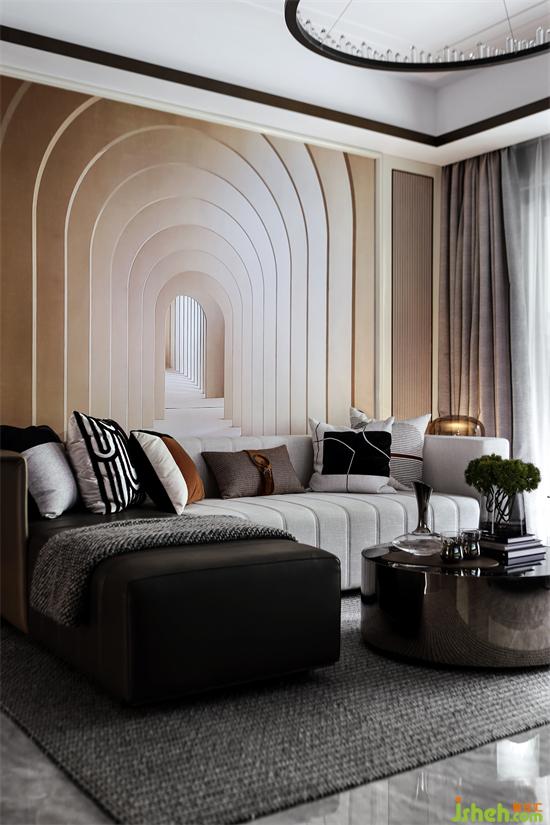 Model House C | 沙發(fā)背景墻延伸感極強(qiáng)的建筑圖案墻紙,包攬了近乎整個客廳墻面,直接帶出了空間的主旋律??此浦皇呛喴椎膱D案,卻能一眼帶來人們好奇心。廣州亞運城精裝樣板房設(shè)計不斷延伸的門后可有盡頭,而深處潛藏何物,無人得知。如同我們的夢想之路,一切都是那么的不可預(yù)知,而帶著無畏與探索的激情,一切都將日漸明朗。