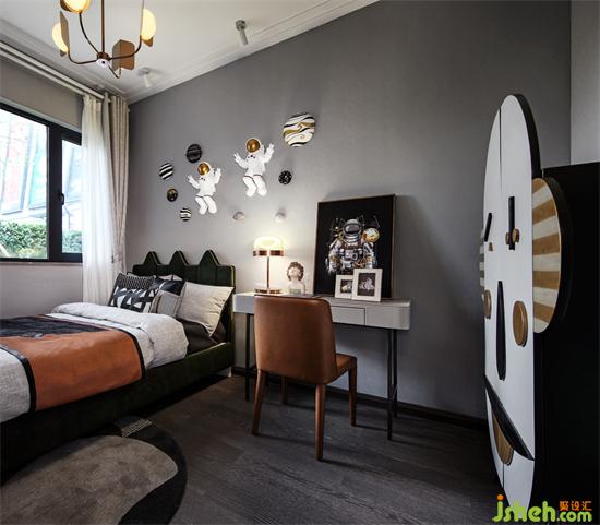 兒童房設(shè)計(jì)以太空遨游為主題,墻面上散布著的裝飾品就像浩瀚宇宙中大大小小的星球,中間的太空人公仔十分的俏皮可愛,仿佛穿上一身航空服,便能跟隨它們?nèi)ネ请H探險(xiǎn),衣柜也挑選了符合孩子爛漫天性的樣式,設(shè)計(jì)師將童趣、想象、科技融合于一室,打造出一個(gè)可以自由暢想的小天地,為孩子種下夢想的種子。