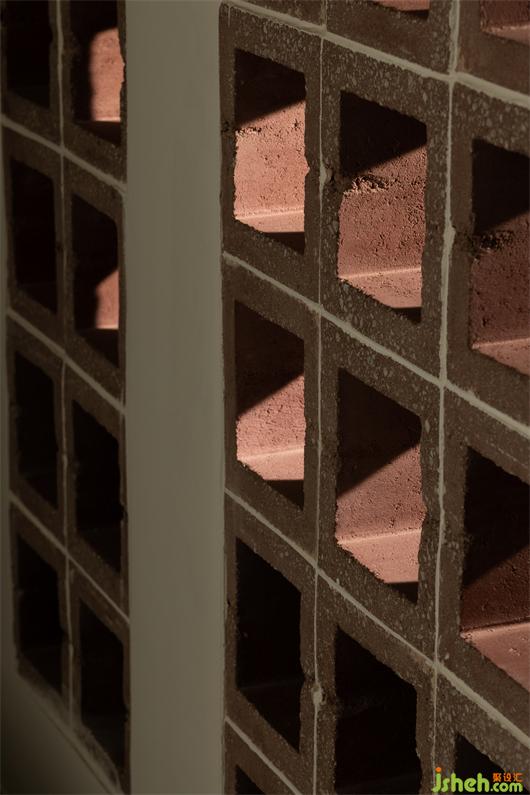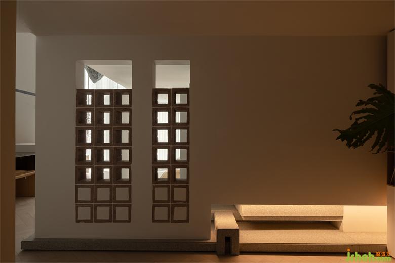 沿著曲面的門頭走進(jìn),迎來滿目磚紅,陽光順著磚格攀升進(jìn)來,折射出紅磚粗粒通透的質(zhì)感。走進(jìn)室內(nèi),光影交織,縱橫錯落,優(yōu)雅的植物與柜體,串聯(lián)起整個空間。