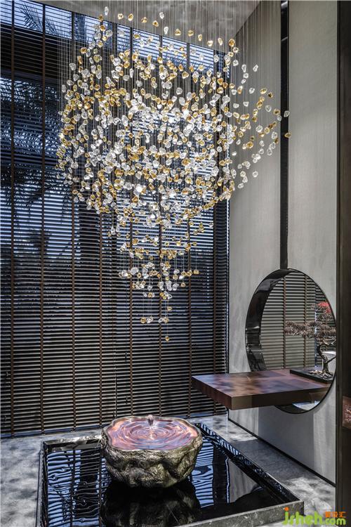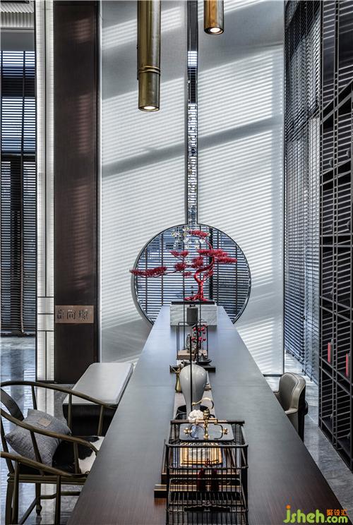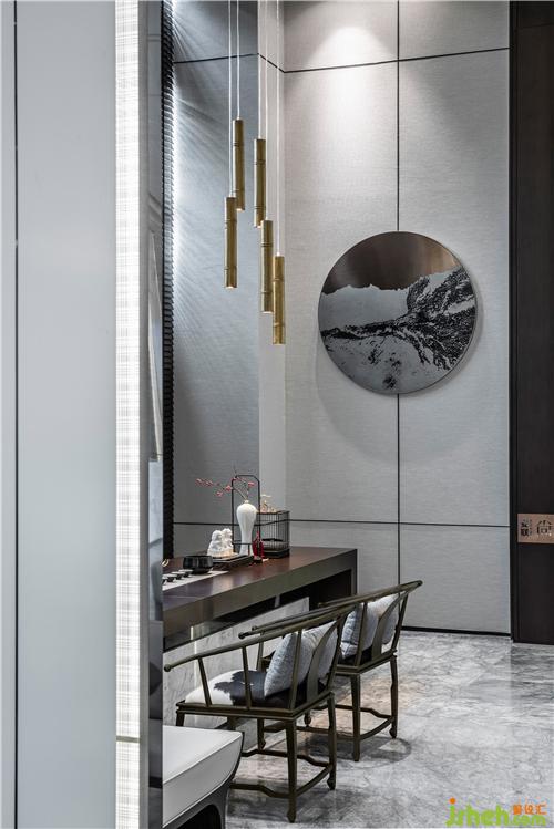 茶藝區(qū)以胡桃木材及大理石磚為主調(diào),水滴狀的玻璃掛飾以靈動(dòng)之勢緩緩落下,展現(xiàn)〝力〞與〝美〞的交互碰撞,使空間剛?cè)岵?jì),體驗(yàn)高貴典雅的恢弘氣勢。
