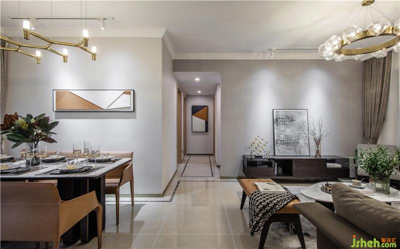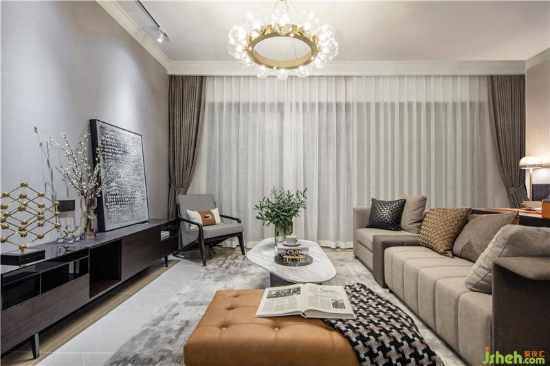 金色圓形吊燈勾勒出別致的精巧,整體線條利落、干凈,光與影設(shè)計了空間,整體以溫馨米灰色為基調(diào),樣板房設(shè)計局部采用深咖色和胡桃木色色來增加空間的層次感,既簡約,又不失個性。