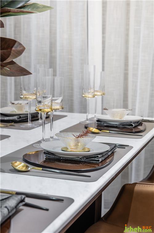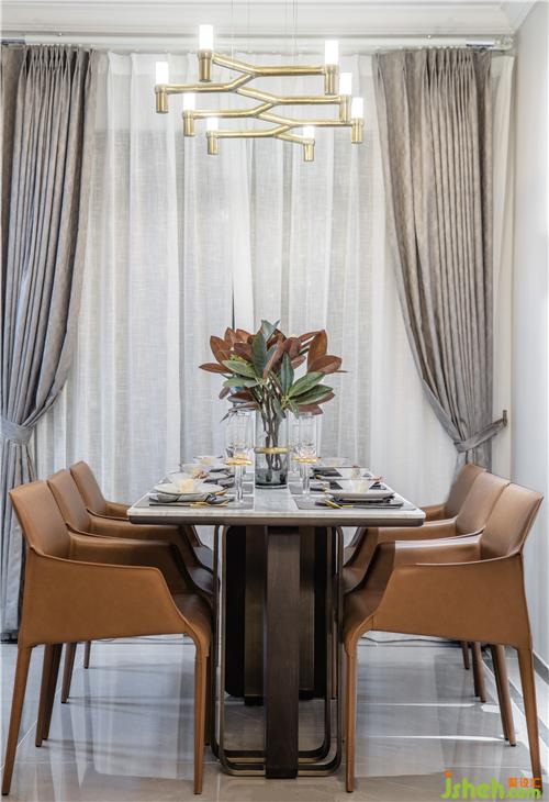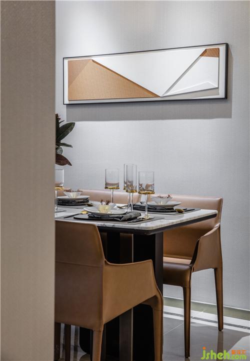 金屬餐具與自然紋理的大理石形成對比,贈予空間一絲浪漫和儀式感,樣板房設(shè)計馬鞍皮材質(zhì)的桌椅在簡式線條烘托之下,深具質(zhì)感。