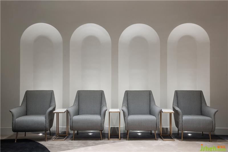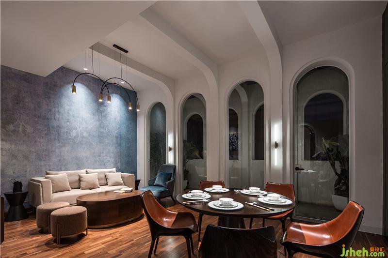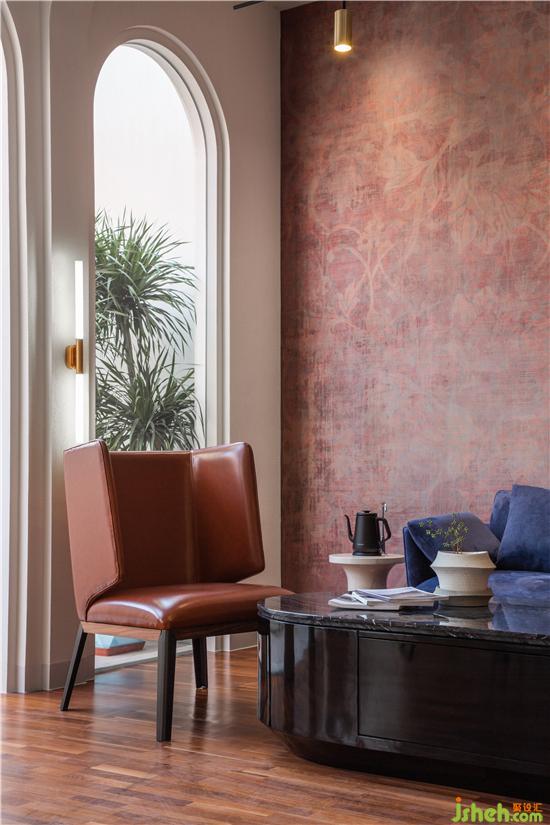 洽談區(qū)內(nèi)利用拱廊營(yíng)造出高挑的建筑感,讓光線以柔和的方式進(jìn)入室內(nèi),墻面上泛灰,紋理淺暗的墻紙模擬出古建筑墻身壁畫(huà)的斑駁質(zhì)感。