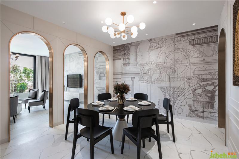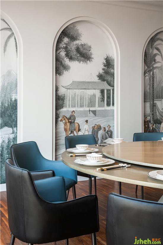 將帶有東方意味的人物風(fēng)景畫(huà)安插在墻面拱廊里,產(chǎn)生一種坐在窗邊看園景的錯(cuò)覺(jué),讓空間變得立體生動(dòng)。