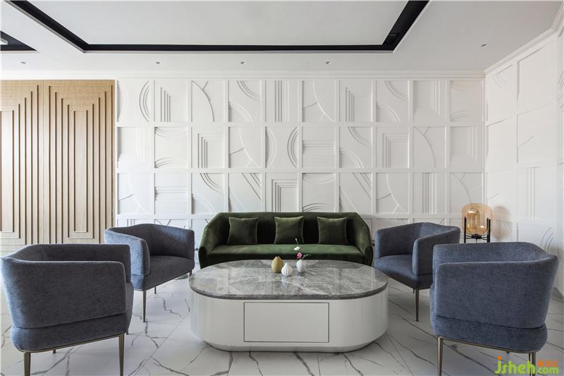 在包含會(huì)議,接待,就餐三個(gè)功能空間為一體的會(huì)晤接待室,墻面上內(nèi)凹造型的設(shè)計(jì)改變了原本墻體的厚重單調(diào),以光影造型營(yíng)造端莊的序列感和層次感。房間的主題來(lái)自于拉斐爾著名的畫(huà)作【雅典學(xué)院】,設(shè)計(jì)寄希望于空間,望各行業(yè)的精英人士能在此交流探討,碰撞出新的創(chuàng)意火花。會(huì)所設(shè)計(jì)