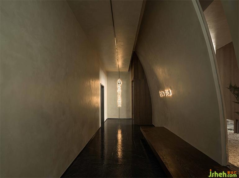 從踏出電梯間,情緒的轉(zhuǎn)換已然開始。入口處與室內(nèi)通過弧形墻面相隔,內(nèi)凹的形狀似乎將人懷抱。通過燈光、材質(zhì)的對比,東方山茶茶室設計用簡單而含蓄的表達讓客人未進其門,已聞其調(diào)。