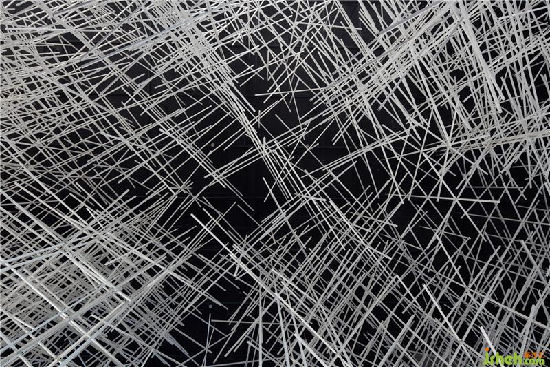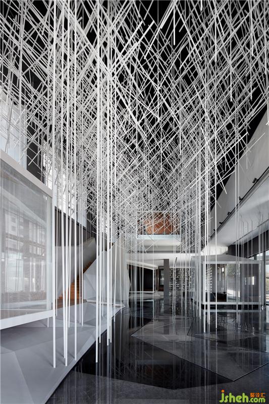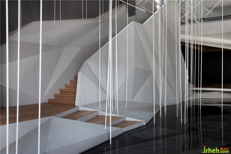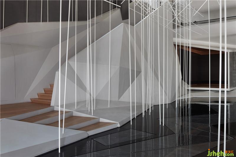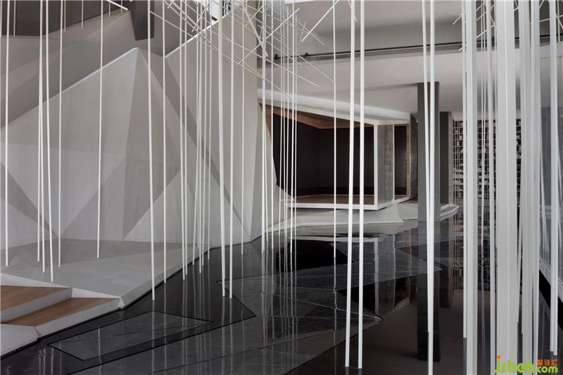 “山陵丘壑”被抽象化為幾何形式;“蘭亭”亦以現(xiàn)代的盒子造型呈現(xiàn),體現(xiàn)高尚不仕、寄情丘壑的理想棲居及最具象征意義的精神依歸;白色線性裝置構(gòu)架在空間中呈現(xiàn)“茂林修竹”、曲逕疏籬、幽篁疏影的詩化意境;“曲水流觴”則幻化為曲徑通幽處,潭影空人心的悠遠(yuǎn)畫面。裝修設(shè)計(jì)
