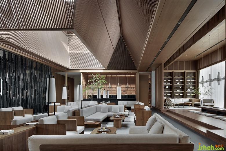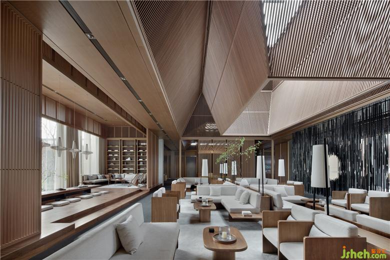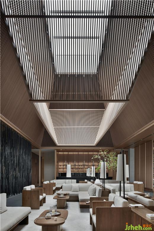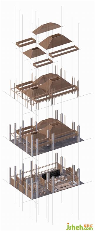 構(gòu)架的頂部吸收并運(yùn)用了中國(guó)古典殿閣與井亭的“盝頂”建筑造型樣式,形成四角上揚(yáng)收合的形態(tài),凸顯出生命氣息與能量聚合的理念,同時(shí)在聚合的頂部留出可呼吸的天窗氣口,充分地吸納天地靈氣和流轉(zhuǎn)的太陽(yáng)光線。從而形成“舍”的傾斜式頂部結(jié)構(gòu)部分。“盝頂”的運(yùn)用,產(chǎn)生出高低起伏、聚合離散的空間節(jié)奏,也營(yíng)造出林泉丘壑、山野幽僻的悠遠(yuǎn)意境。