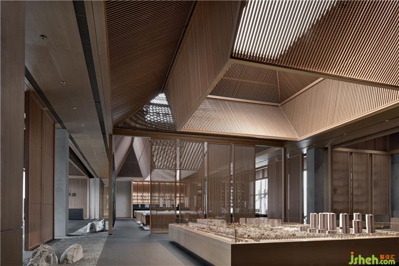 另外,針對(duì)主體沙盤(pán)區(qū)和深度洽談區(qū)等主要的空間場(chǎng)域,上挑的頂部能量再次被聚合起來(lái),以同樣聚合的造型再次向下方的功能承接區(qū)域傳遞能量,同時(shí)起到過(guò)濾上部光線及凝聚并傳導(dǎo)能量和氣息的功能。
