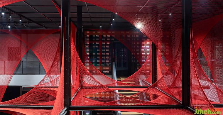 中央?yún)^(qū)域外,設(shè)計(jì)使用白橡木、肌理漆、金屬網(wǎng)、水磨石等簡潔材料。藝術(shù)博物館裝修設(shè)計(jì)在灰黑空間基底上,立面和頂大量使用白色紗錠與五色彩線陣列交縱,以此對(duì)外圍空間進(jìn)行半遮蔽,將空間視覺焦點(diǎn)始終引向中央。