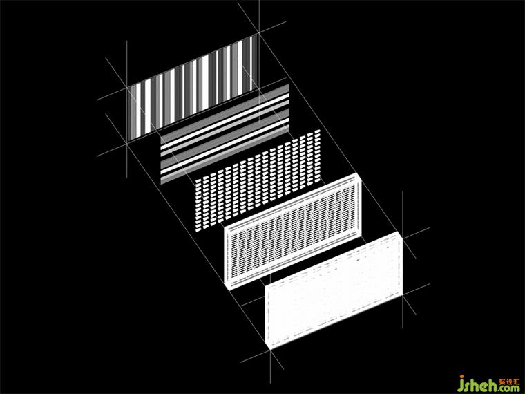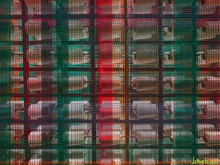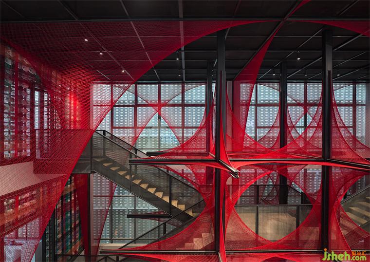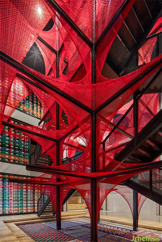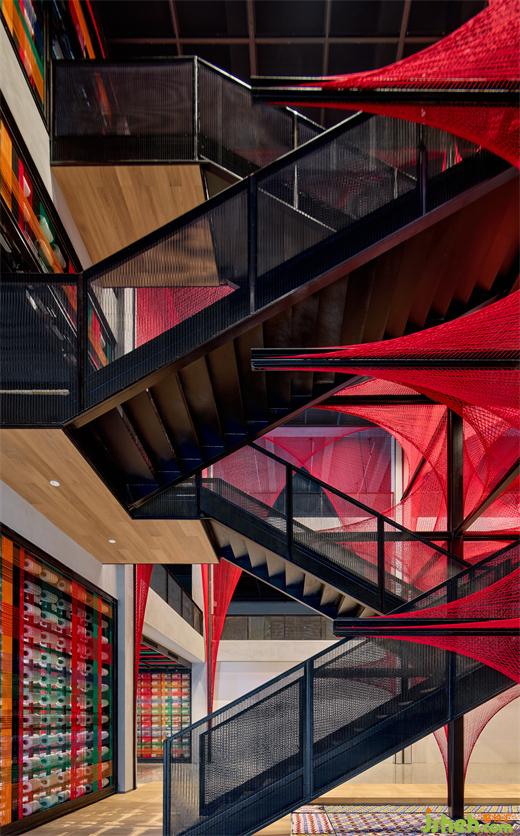 垂直交通由兩組鋼制樓梯折線上升打通,并通過兩處位于裝置中心的平臺(tái)連通,使樓梯與中心裝置形成互看、融合。藝術(shù)博物館裝修設(shè)計(jì)工業(yè)屬性的樓梯線性結(jié)構(gòu)來自西蘭卡普紋樣中的六邊形,并同時(shí)應(yīng)用在外圍鋼結(jié)構(gòu)的鏤空形上。當(dāng)精微的圖形浮出,展開成超乎經(jīng)驗(yàn)的宏大,空間場所的矛盾與張力將呼喚新的想象。