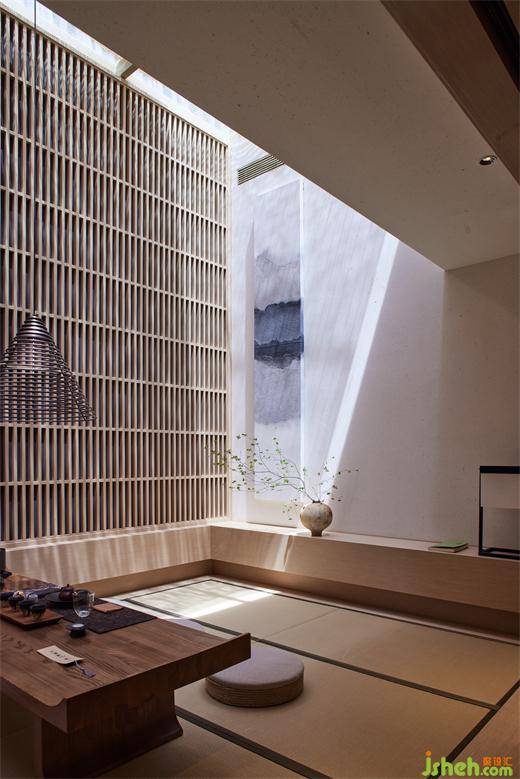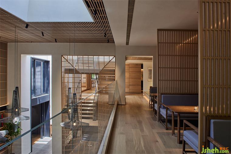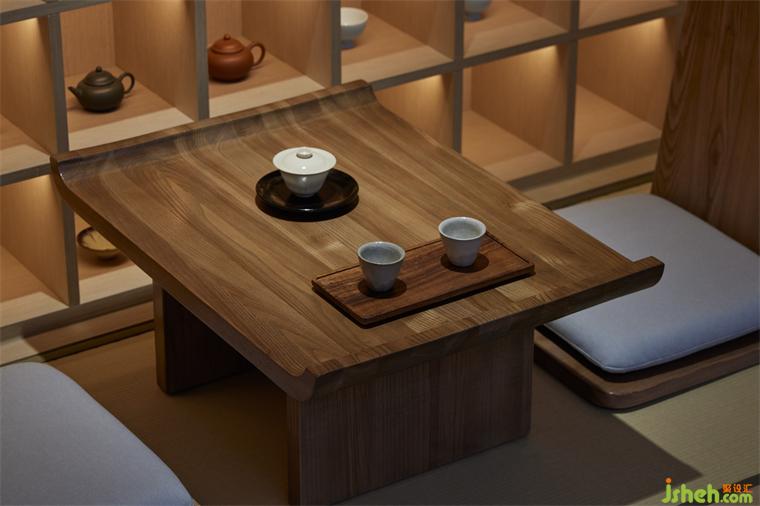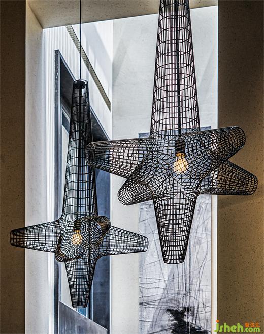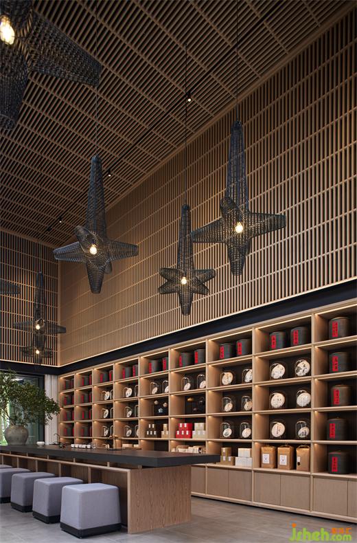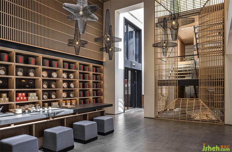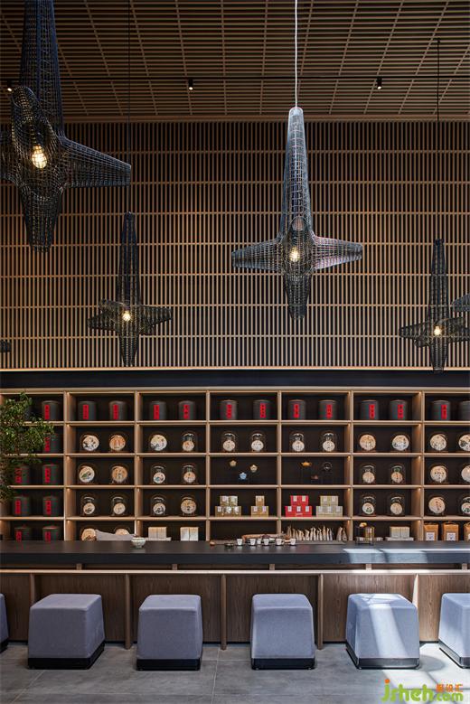 由此向內,不規(guī)則陣列的異形絲網(wǎng)燈由挑空的屋面垂下,細格柵由天花如瀑而下,作為條形茶臺的背景,筆觸簡明有力。