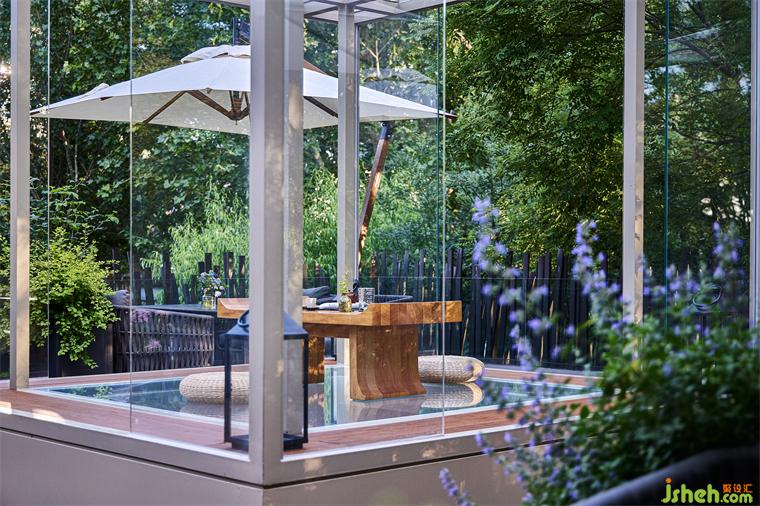 行至露臺,設計師保留了原有的一方天窗,并在其上建玻璃茶亭,放置小幾蒲團。麗都花園內已亭亭如蓋,樹冠環(huán)抱露臺,茶亭之外,四季流轉清晰可辨。年輕茶客絡繹不絕探訪茶亭,熱鬧之外,屬于中國人精神向度里的人文性也一定在生長。