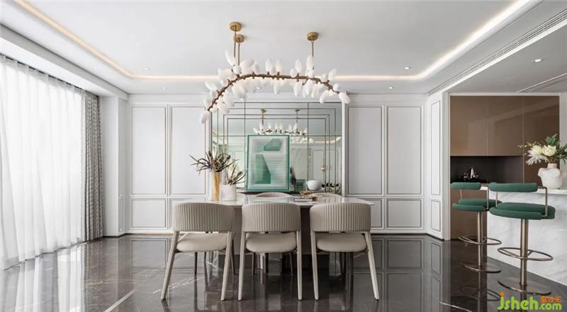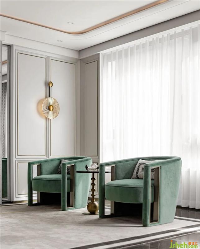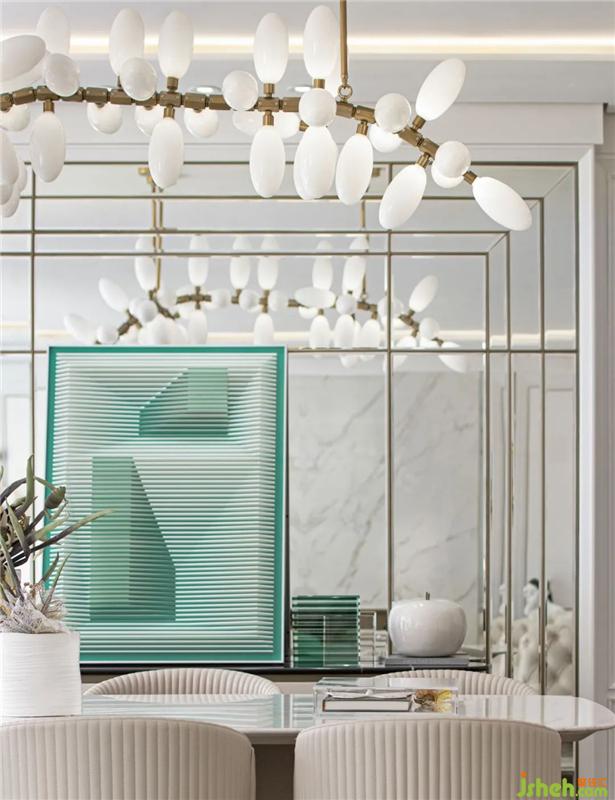 設(shè)計的開篇,豐富的陳設(shè)與裝飾維系著空間優(yōu)雅的節(jié)奏。在白色大理石墻面的映襯下,柔軟的米色皮質(zhì)沙發(fā)、祖母綠色的絲絨座椅、形制不規(guī)則的當代感銀色茶幾、精致華麗而又頗具趣味的藝術(shù)擺件,構(gòu)成了一幅摩登的美學(xué)畫面,其間的每一處褶皺、每一抹色彩、每一條紋路,樣板房設(shè)計均是對優(yōu)雅精神的無聲詮釋。