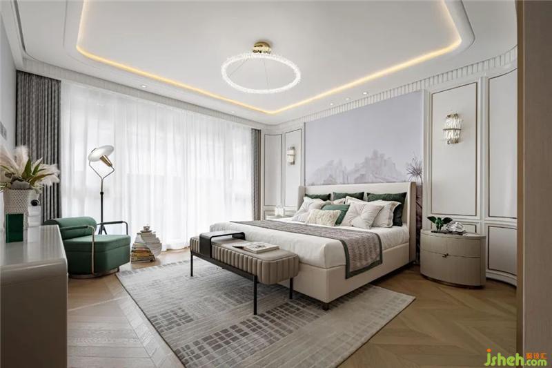 順著大理石臺階步入二層主臥,全明落地窗納入了通透的自然光線。米白、祖母綠、淺棕的色彩組合,及玻璃、金屬、布藝的材質(zhì)碰撞,使得空間更顯迷人的法式優(yōu)雅。單人墨綠扶手座椅搭配精致造型的落地燈,構(gòu)成了一處休閑靜處的角落。在這里,居者可以隨意擇一本書,享受優(yōu)雅的午后時光。