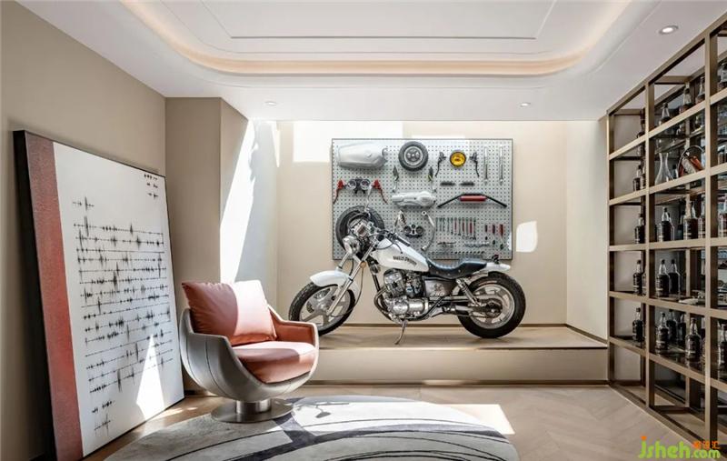基于居者的個(gè)性喜好與審美主張,設(shè)計(jì)師在多功能娛樂室構(gòu)建了一處自由隨性的場(chǎng)域。無論是炫酷的哈雷機(jī)車,還是陳列在酒架上的美酒,亦或是隨意放置于地面的抽象藝術(shù)板畫,皆透露著不凡的品味,彰顯出居者灑脫、個(gè)性、自信的生活態(tài)度。