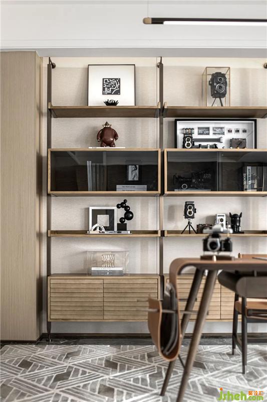 雅致的單人扶手座椅、抽象的藝術版畫、翠綠挺拔的綠植,以自然的姿態(tài)走進居者的生活,映射出日常的充實與優(yōu)雅的美學。一側的工作區(qū)中,老式電話、藝術擺件、膠片相機等物件的裝點,加之少許愛馬仕橙的融入,勾勒出主人內心的個性與卓然的品味。