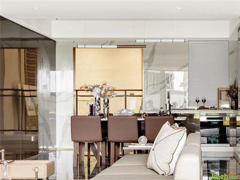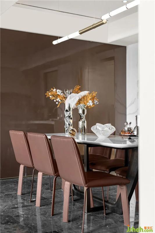紅棕色皮革餐椅與纖細藝術吊燈的組合,在大理石地面的映襯下,譜寫著低調的奢華,透露出精致而時尚的就餐氛圍。