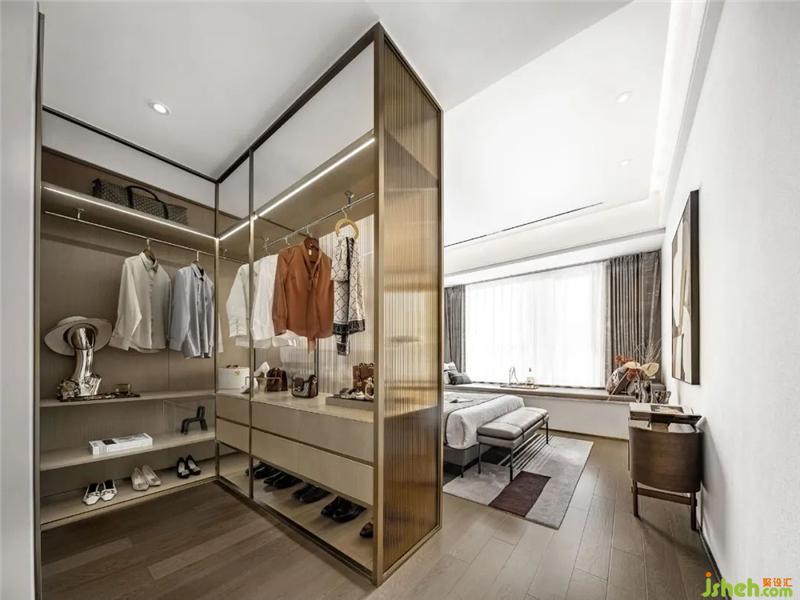 主臥延續(xù)愛馬仕色系的成熟與穩(wěn)重,搭配風格及造型相統(tǒng)一的地毯與掛畫,構設出空間的整體基調。在拐角區(qū)域的留白處,設計師通過衣帽間的設置,賦予居者自由的動線體驗,與都市人居的品質感相貼合。