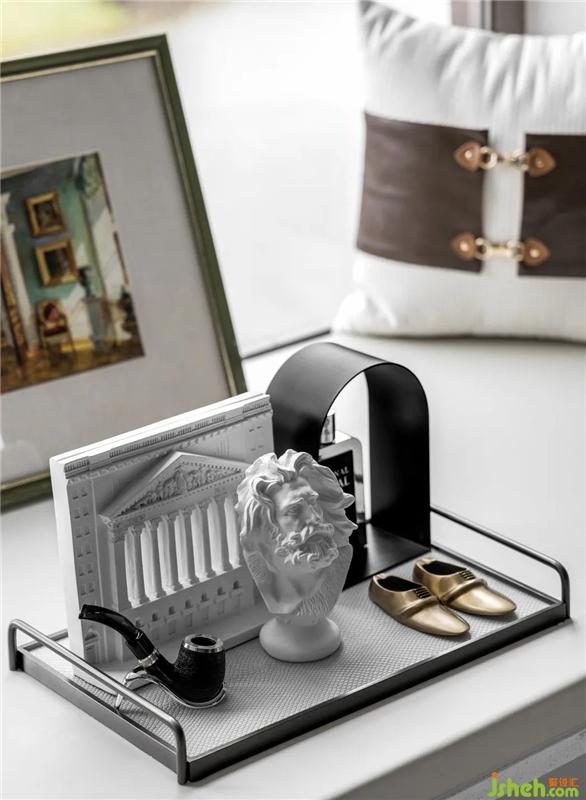 頗具質(zhì)感的藍(lán)色,加之木色與白色的穿插,調(diào)和出次臥沉穩(wěn)高級(jí)的美學(xué)視感。同時(shí)在軟裝搭配上,墻面的同色系幾何裝置、桌角處的金屬臺(tái)燈與人物石膏雕塑,從生動(dòng)的外部造型到內(nèi)里的精神世界,豐盈著空間的藝術(shù)內(nèi)涵,迸發(fā)出Art Deco鮮活的美學(xué)力量。