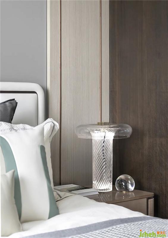步入主臥,淺淡的米白、青綠、灰色,交織出溫和平靜的空間情緒。在考量空間比例的基礎(chǔ)上,設(shè)計(jì)師透過巧妙的對(duì)稱布局與空間構(gòu)設(shè),以圓與線條紋理的組合、玻璃與木質(zhì)的搭配,令整體空間呈現(xiàn)出一幅協(xié)調(diào)的構(gòu)圖畫面,又不失細(xì)節(jié)的質(zhì)感。