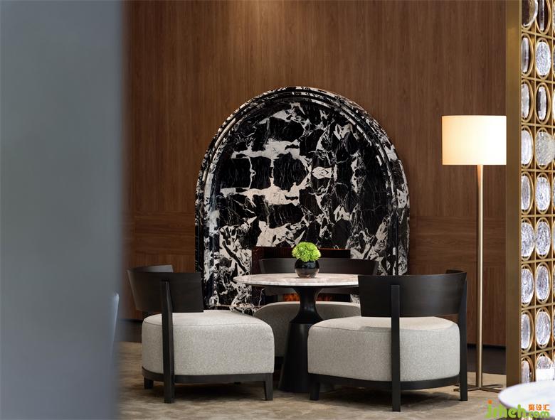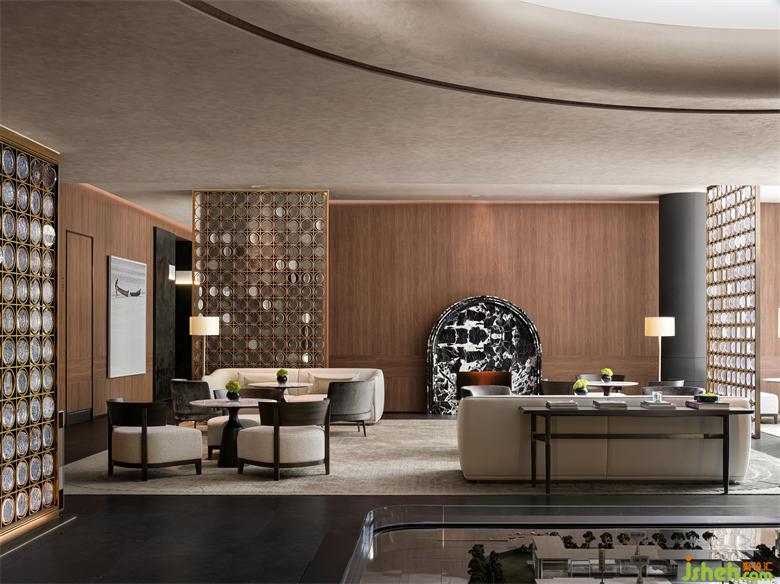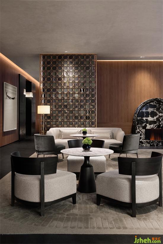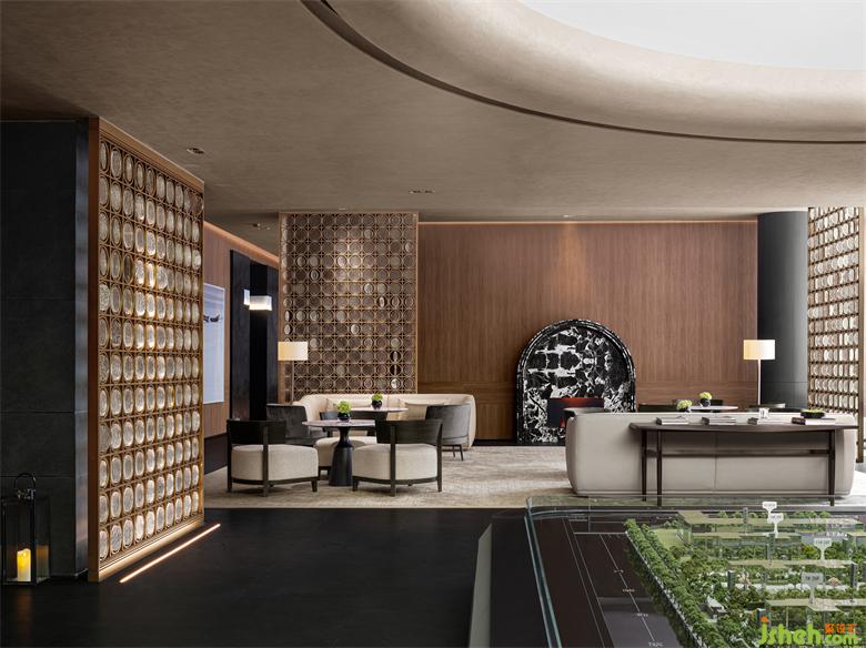 深色大理石的拱門型壁爐,售樓處設計復古雅致的木色墻面,敦實落地的座椅,被屏風柔化的自然光線,營造出一處奢華私密的深度洽談空間。