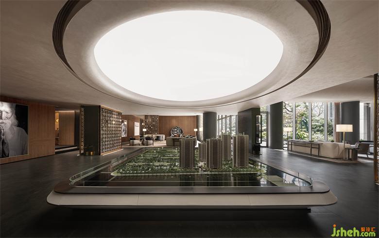 由沙盤區(qū)步入深洽區(qū),整體沒有封閉售樓處設計的空間,四周均以亞克力玻璃幕墻作為隔斷。售樓處設計實現空間功能分區(qū)的同時,在視線上保持了空間之間的溝通,巧妙勾勒出一個會呼吸的自由空間。
