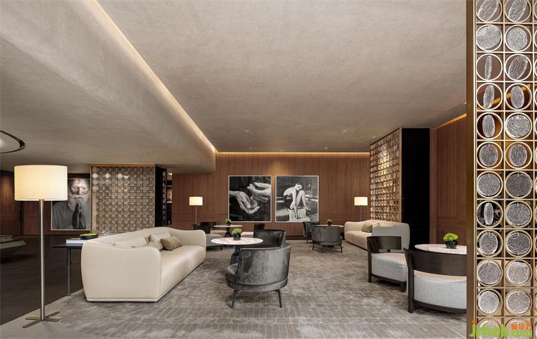 由于負一層的部分降板結構,導致空間高度受限,售樓處設計師利用光感提升空間高度,用溫暖的裝飾與柔和的光影營造了一種隨遇而安,使得原本幽暗的空間更契合寶格麗風售樓處設計的柔和雅致。