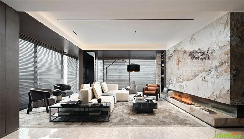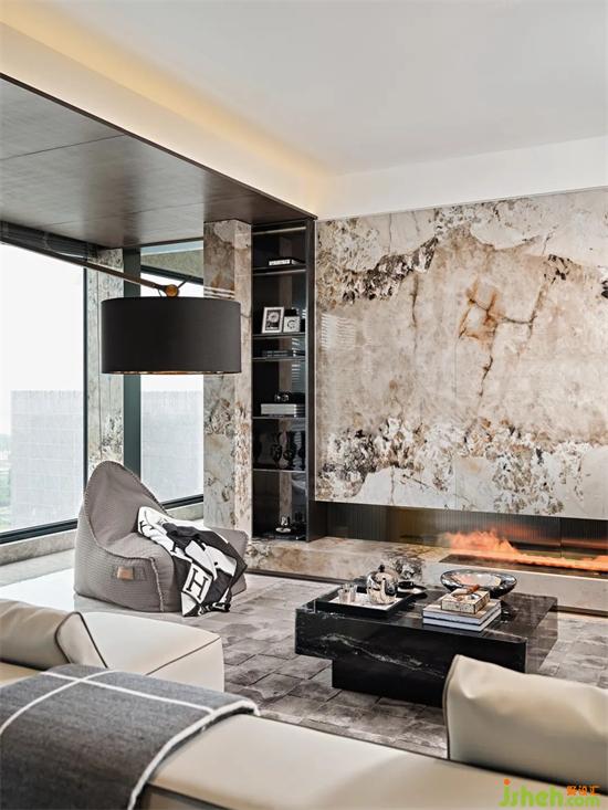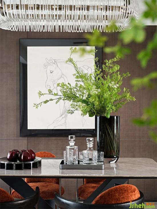 大面積暖色花紋的石材,結(jié)合四周簡潔流暢的線條裝飾和中性調(diào)的樣板間設(shè)計家具軟裝,和諧而不繁復(fù)。墻面底部的漂浮結(jié)構(gòu)減去石材墻面的體量感,愛馬仕橙的軟裝點綴增添輕盈明快的優(yōu)雅氣質(zhì)。