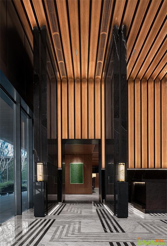 黑白線條交錯(cuò)的地磚,交替組合的圓形與方形元素,既延續(xù)并重構(gòu)了寶格麗的經(jīng)典圖案,也為大堂整體深色的空間里增添了活躍的層次感,以寶格麗低調(diào)、質(zhì)感的設(shè)計(jì)之形建構(gòu)尊貴、舒朗的內(nèi)在體驗(yàn)及售樓處設(shè)計(jì)感受。
