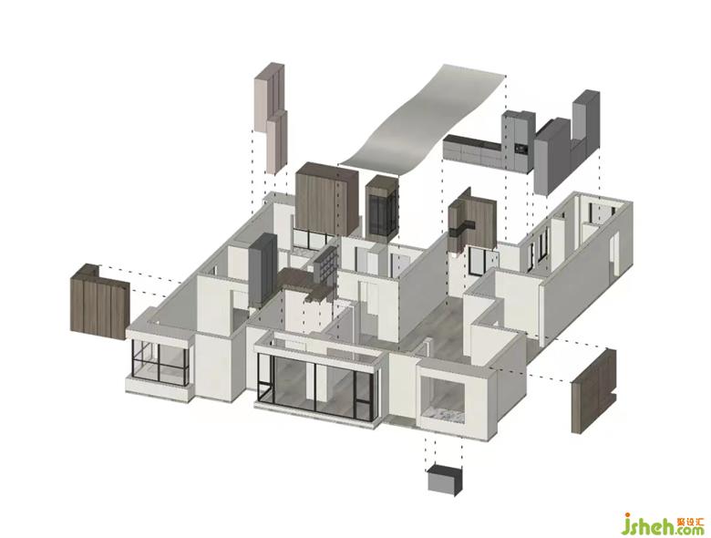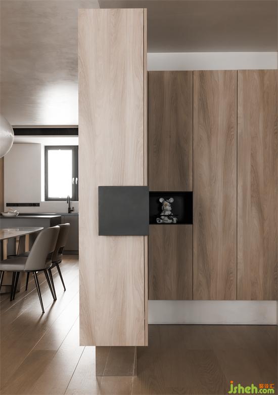 把設(shè)備間納入中廚后,擴(kuò)大中廚空間滿足正常的一個(gè)功能性。家裝設(shè)計(jì)外部原餐廳空間一分為二,新增西廚區(qū)域滿足業(yè)主日常放一些咖啡機(jī)等小型電器,能操作一些簡單的西式料理。家裝設(shè)計(jì)增加功能性的同時(shí)讓餐廳與中西廚互通,也解決了原餐廳過于狹長的弊端。