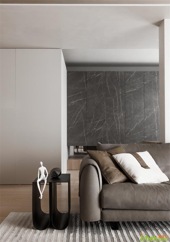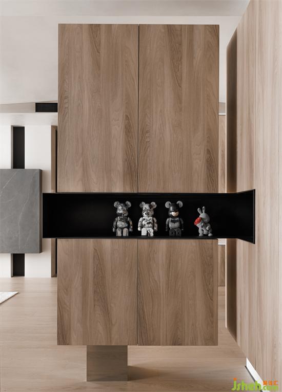 玄關(guān) L 型鞋柜底部鏤空,用鏡面柱體支撐,形成視覺懸浮。中間用黑色不銹鋼橫板連接兩個(gè)面,可以進(jìn)門隨手放一些隨身物品。家裝設(shè)計(jì)兩面柜體中間留有一條縫隙,若隱若現(xiàn)的人物動(dòng)態(tài)從中透出,給玄關(guān)注入了動(dòng)態(tài)活力,避免入戶一望到底的同時(shí)也使空間有互動(dòng)性。