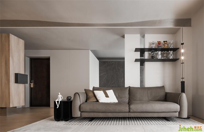 客廳與書房的隔墻中間留有一條縫隙,上設(shè)鋼板連接至?xí)浚寖蓚€(gè)空間有了互動(dòng),鋼板上也能放一些業(yè)主收藏的潮玩手辦,一舉兩得。