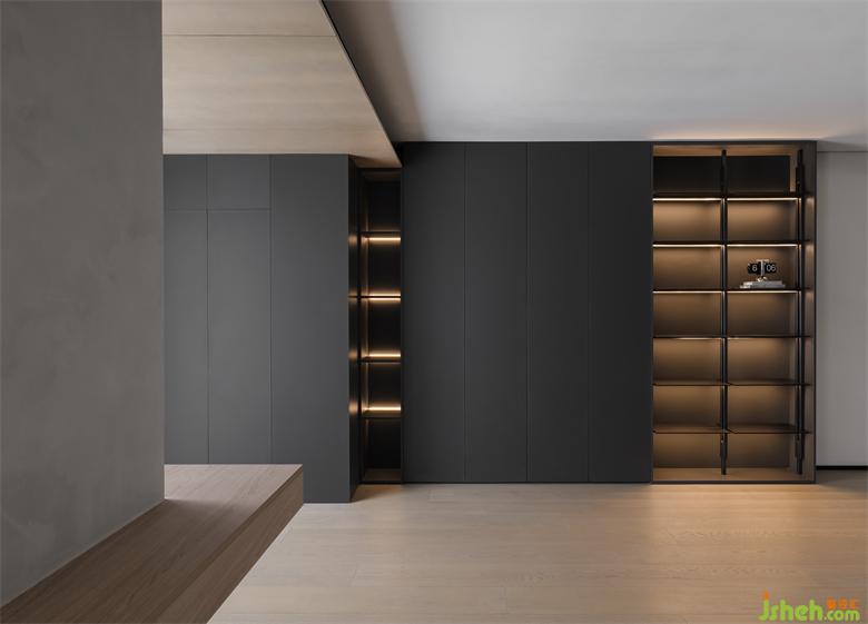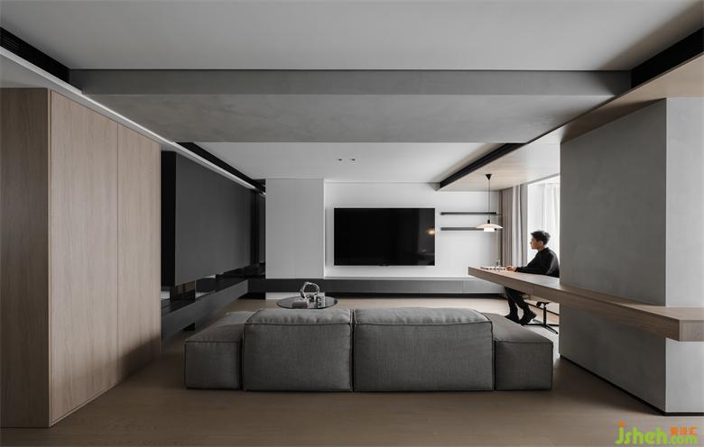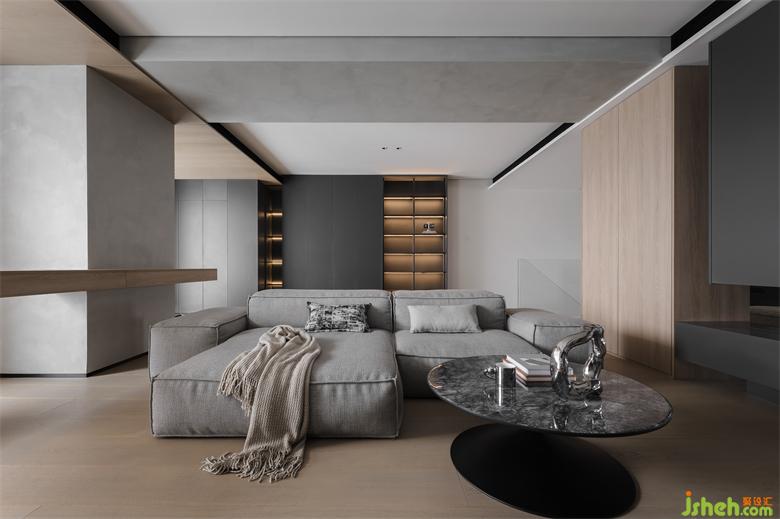 整體空間以經(jīng)典黑白灰加以原木色為主題配色 。Living Divani 的定制款沙發(fā)是整個(gè)區(qū)域的核心,搭配十二時(shí)慢的藝術(shù)感茶幾,呈現(xiàn)出鮮明有力的表現(xiàn)力,主宰了空間的第一印象。黑色、木色不同紋理的門板搭配上鏡面給人帶來(lái)的呼吸感,家裝設(shè)計(jì)不規(guī)則的設(shè)計(jì)中又有著規(guī)則的舒適度。收納功能也在隱形中得到了提升。