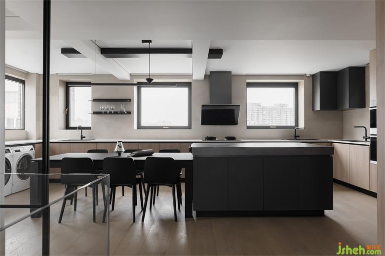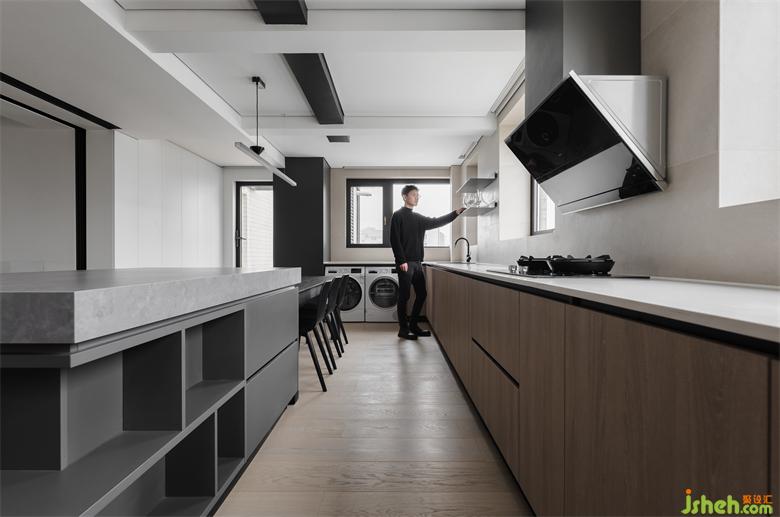 相比餐廚分離式設(shè)計(jì),廚房里融入餐廳設(shè)計(jì),中西廚可同時(shí)烹飪,就餐一氣呵成,優(yōu)化了動(dòng)線的同時(shí)也有了大平層的寬闊感。收納型島臺(tái)連接餐桌,家裝設(shè)計(jì)將儲(chǔ)物與就餐完美結(jié)合。U字形的操作臺(tái)面與之相結(jié)合的下柜,收納空間的提升肉眼可見,摒棄壓縮空間的上柜,在墻面處安置兩個(gè)置物架,帶給空間的是輕盈舒適感。