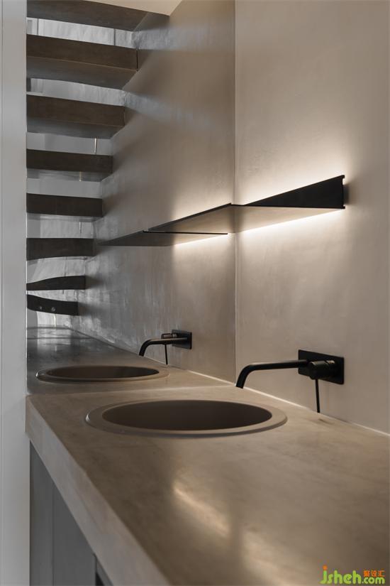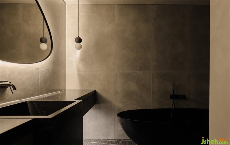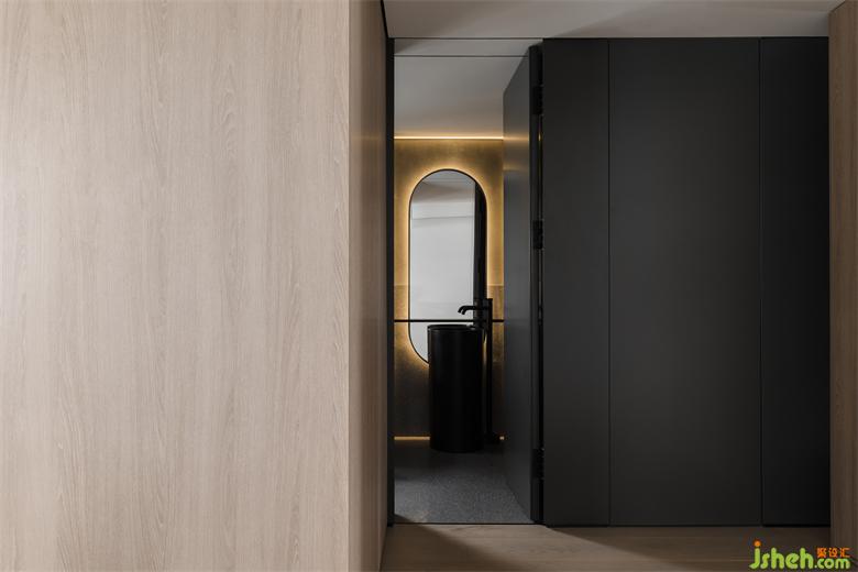 隱形門打開后,直入眼簾的黑色水磨石一體式獨(dú)立盆,美觀高級(jí)。家裝設(shè)計(jì)橢圓形鏡面背后的燈帶給衛(wèi)生間賦予了一層神秘面紗,氛圍感十足。