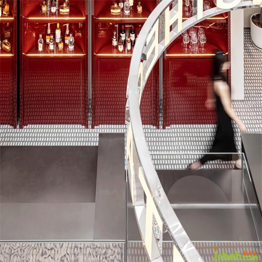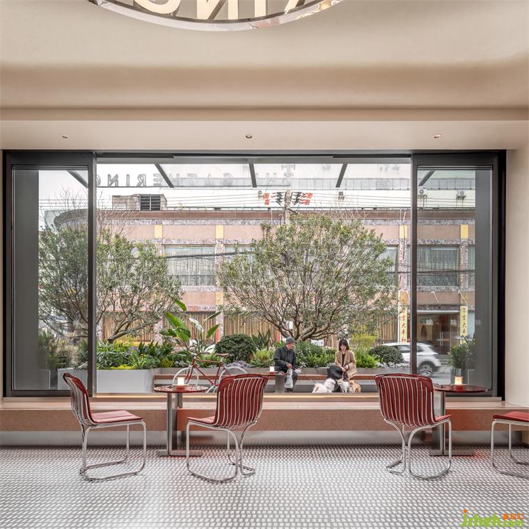舊建筑的立面與海上和集建筑的開放式立面也展開了新舊對話。海上和集設(shè)計擴寬且?guī)в谢壍拇把厝菁{、伴隨并定義了鄰里可以以任何偶然的行為與空間與街道雙向互動??汕度胲壍雷杂梢苿拥倪呑?,裝修公司采用銀色的時尚工業(yè)風(fēng)格搭配簡約的紅色圓形玻璃桌面,成為街道的活力元素。