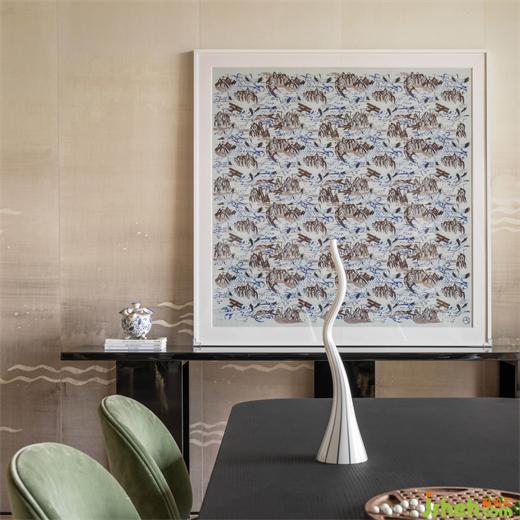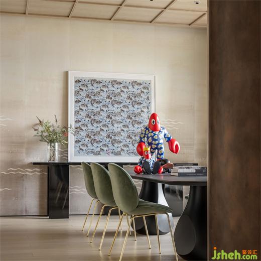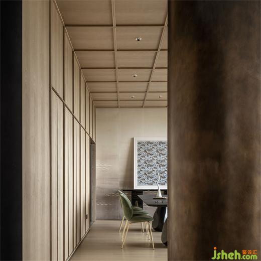 細(xì)致的家宅空間,如音樂般富有節(jié)奏韻律,有聚合之地更有靜處方所。在休閑區(qū)與茶室之間,私人別墅裝修設(shè)計(jì)師插入藝術(shù)金屬體塊將兩個(gè)功能區(qū)分隔開來,圓弧之上,作有凹凸的線條,仿若雕塑,而體塊背面又兼具著書架的實(shí)用功能。