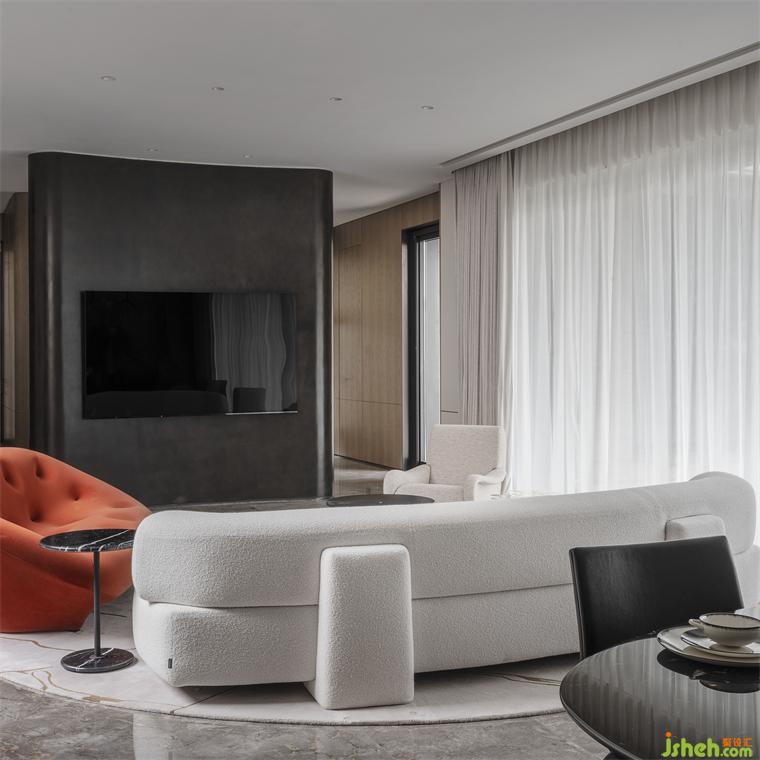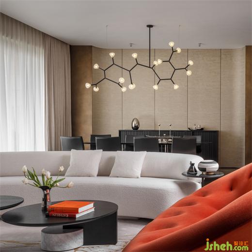 上行一層,抵達(dá)家中的客餐廳,米灰色系為主調(diào),圓形地毯與茶幾圍出親密聚合的意味。Gogan系列長沙發(fā)來自MOROSO,現(xiàn)代感流線設(shè)計(jì)與CASSINA單人座椅相應(yīng)和,如同柔軟的雕塑,輕盈有型。私人別墅裝修設(shè)計(jì)而Ligne Roset沙發(fā)卻以橘色宣告?zhèn)€性,鳥巢般的造型更平添舒適質(zhì)感。此間MOROSO的金色三腳邊幾以不規(guī)則拼接元素凸顯出自然形態(tài)與設(shè)計(jì)美學(xué)的結(jié)合,趣致盎然。Tom Dixon的香氛,更讓家中空氣有跡可循,捕捉五感開啟的確幸。