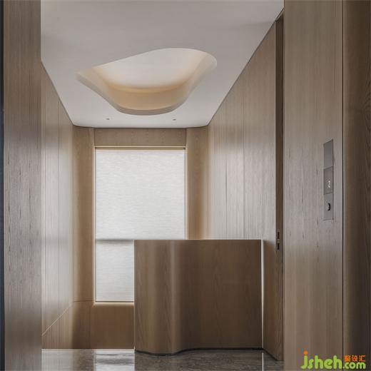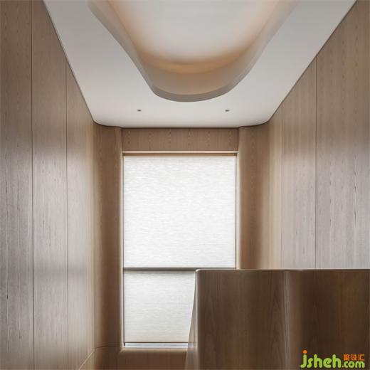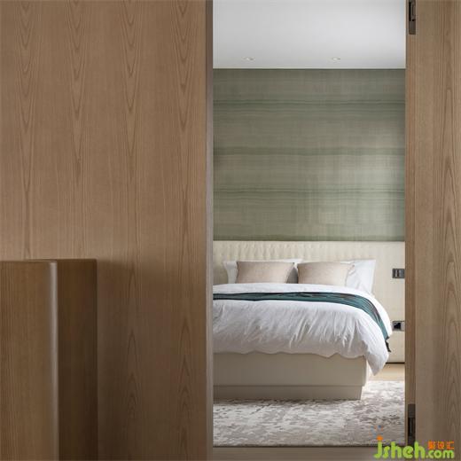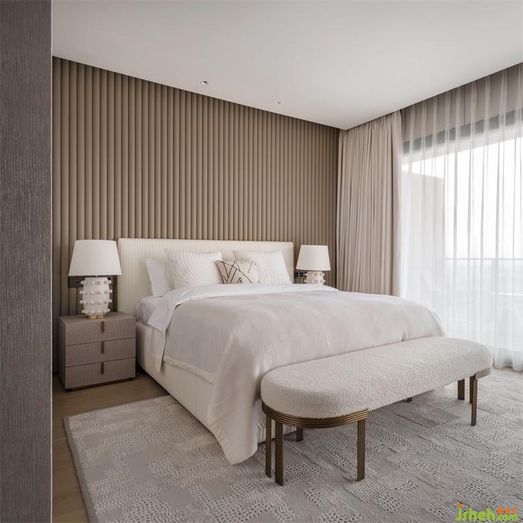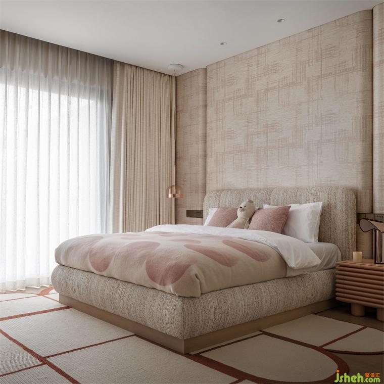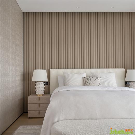 行至二層是臥房區(qū)域,木與白色的主臥空間,頗有美學中“見白非白,私人別墅裝修設計白由心生”的境界。立體起伏的背景墻面配以Kelly Wearstler臺燈,底座的雕刻亦在有趣與精致之間形成詼諧對比。